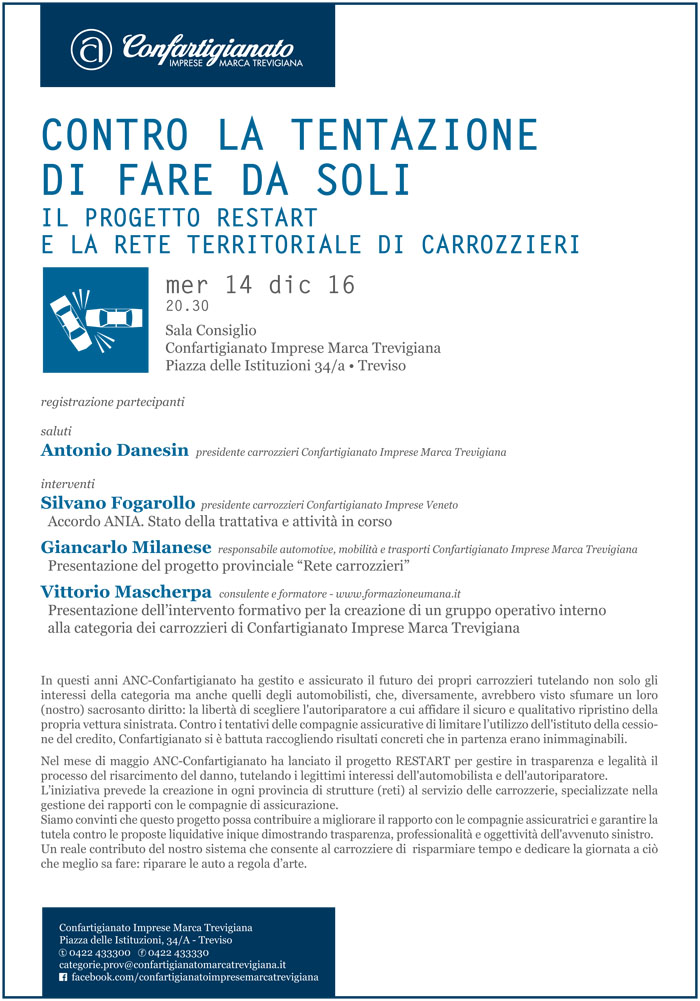 "CONTRO LA TENTAZIONE DI FARE DA SOLI" INCONTRO PROVINCIALE DEI CARROZZIERI 14.12.2016mercoledì 30 novembre 2016 12.27Nel corso dell'evento verrà presentato il progetto per la costituzione di una rete provinciale di carrozzerie.